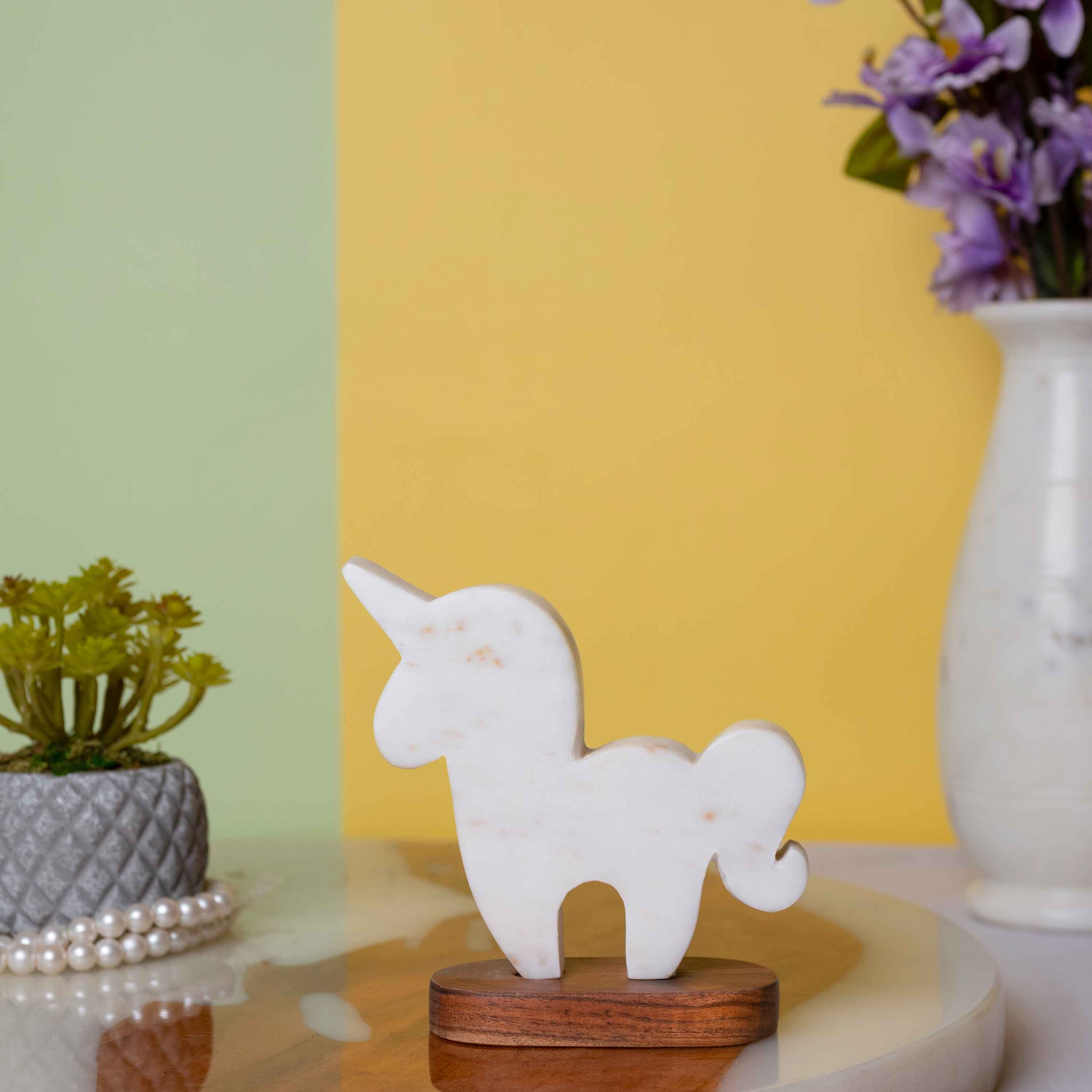 UNICORN WHITE MARBLE DECORATIVE OBJECT WITH ACACIA WOOD BASE