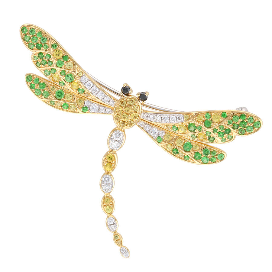 Dragonfly Brooch with Sapphires and Garnets in Yellow Gold