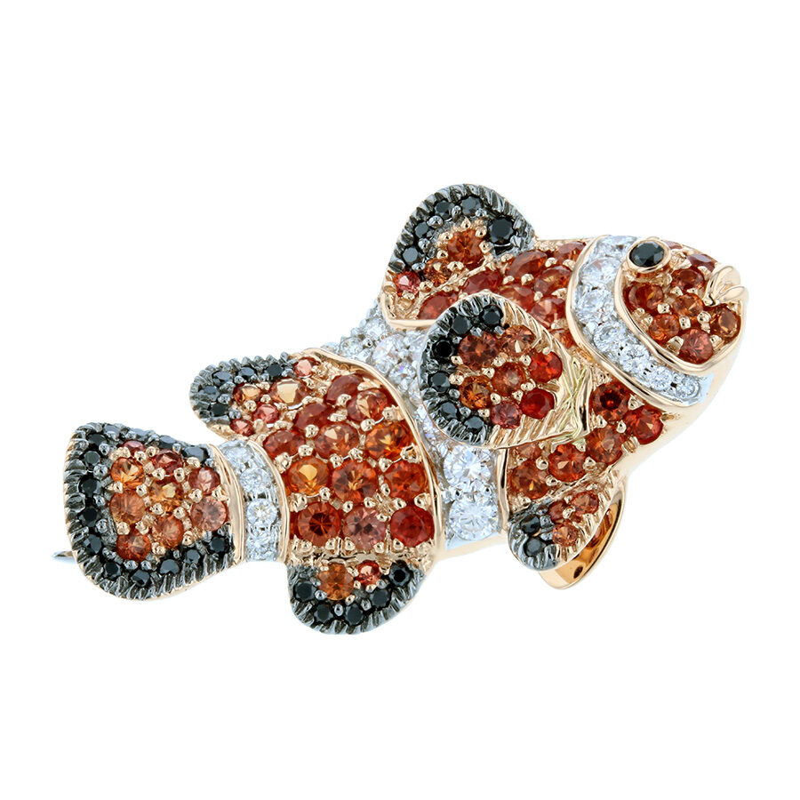 Orange Sapphires with Black Diamonds in Rose Gold Fish Brooch