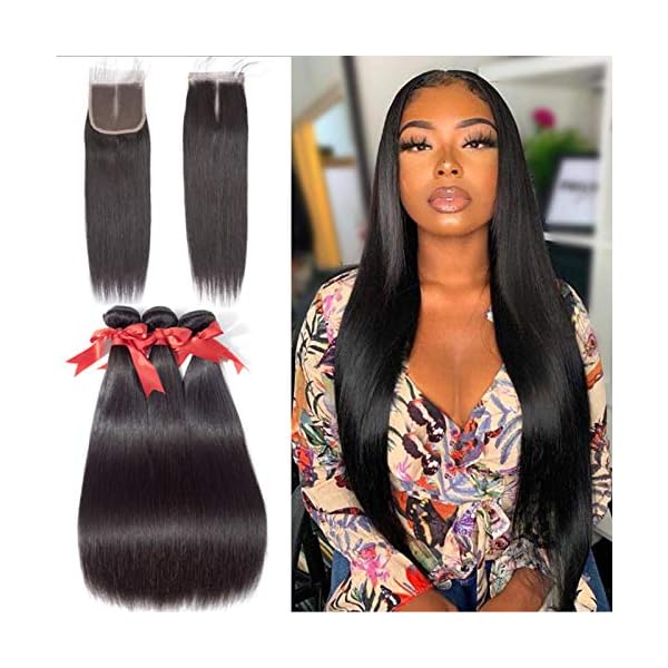 Anknia Brazilian Virgin Hair Straight 3 Bundles With Closure Weave Human Hair Bundles With Closure Mink Remy Hair Extensions 4×4 Inch Lace Closure Free Part With Baby Hair (10 12 14 10)