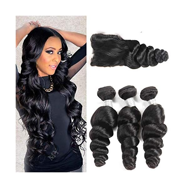 Brazilian Loose Wave Hair Weave 3 Bundles with closure Loose Curly Brazilian Virgin Tight Loose Human Hair Weave 100% Unprocessed Hair Weft Extensions Natural Black Color(16 18 20 14, loose wave)