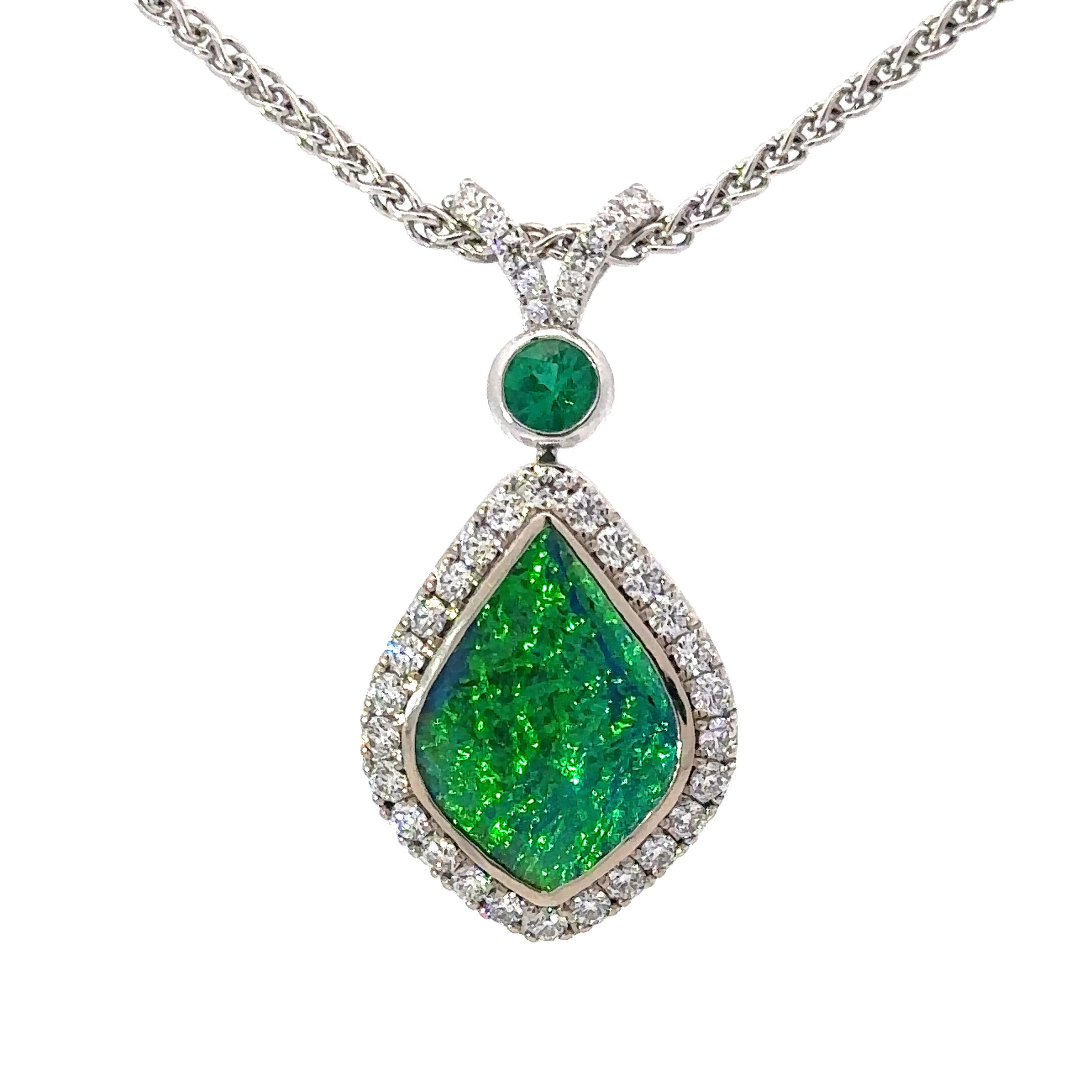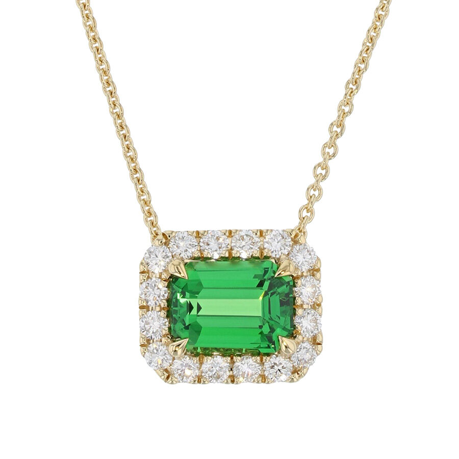 Emerald Cut Green Garnet in Yellow Gold Halo Necklace